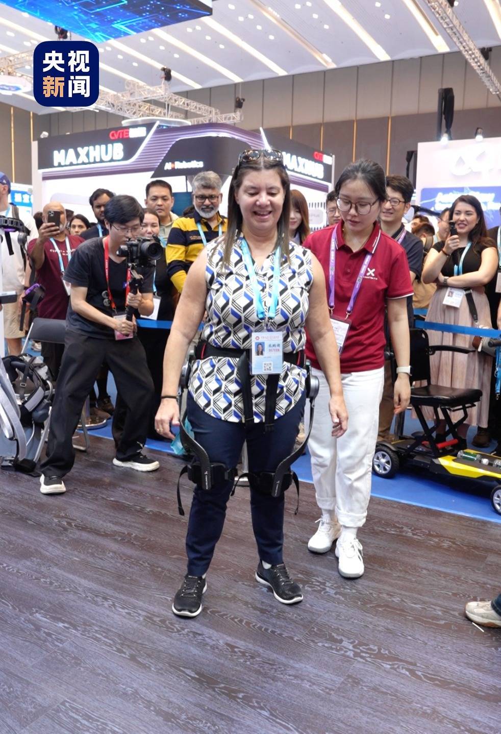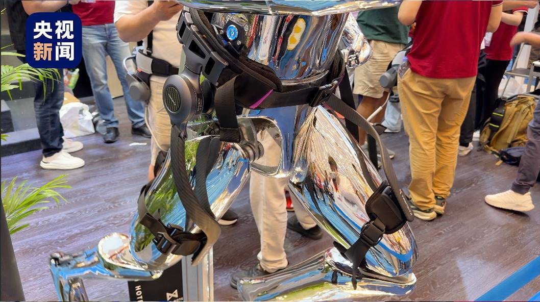 r在一家外骨骼机器人展位旁排队